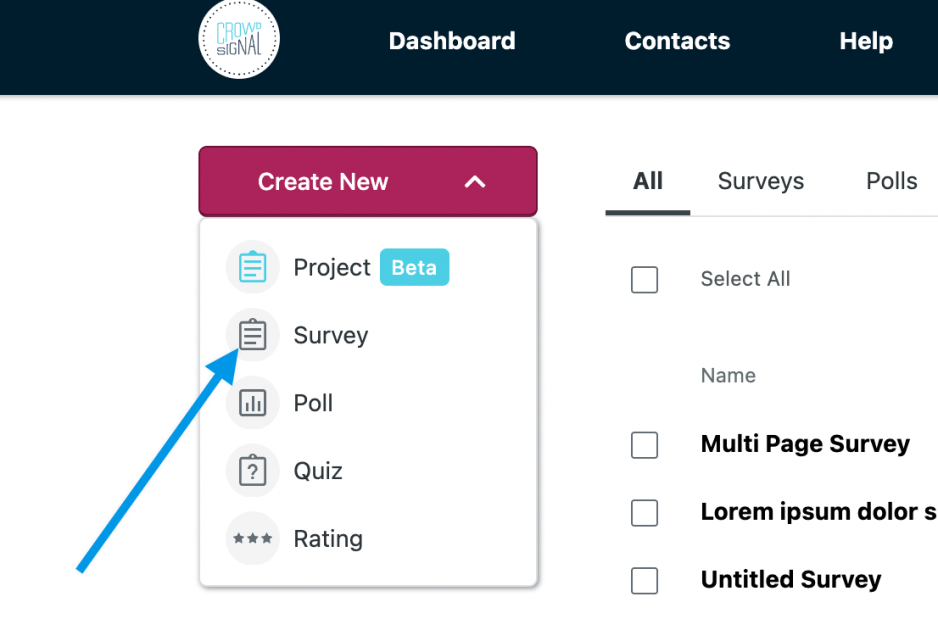 To begin, head over to your Crowdsignal dashboard and click the Create New button then select Survey.