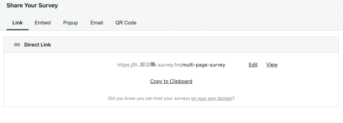 If desired, you can adjust the appearance and settings for the survey using the other tabs in the editor. When your survey is ready, click on the share button. A window will appear with a link to the survey. Copy that link to your clipboard by using the handy copy link button or manually.