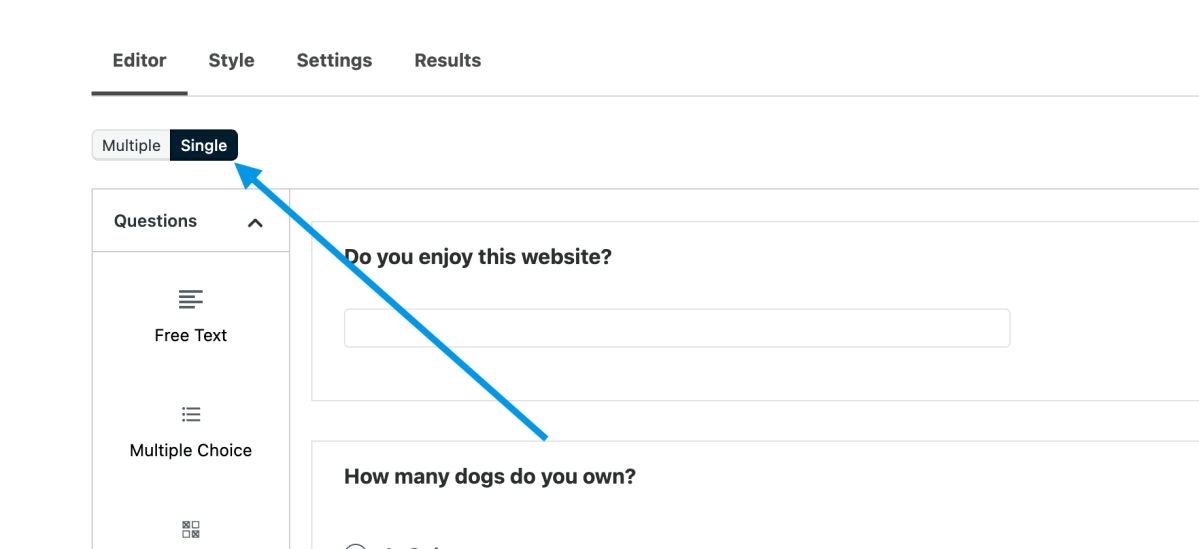 Add your questions. Each question appears in its own block in the editor. Each block will be an individual page in the final survey.