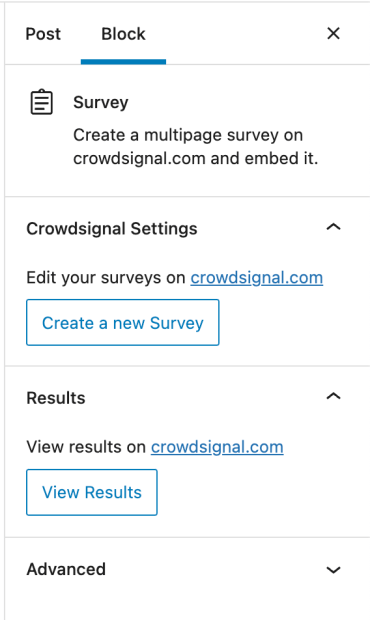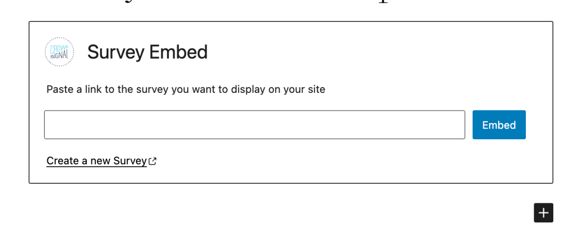 The Survey Block gives you an easy way to display a survey on a WordPress site. If you have a WordPress.com site, this block is already available. If you are using WordPress with a different host, you can install the CrowdSignal Forms plugin.