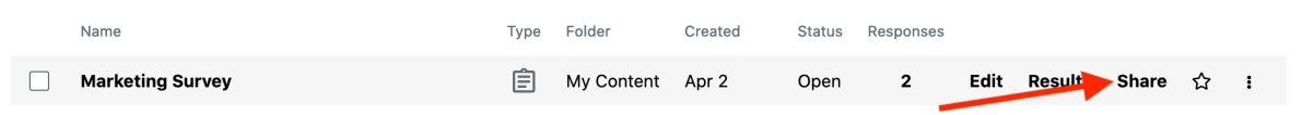 Now let’s walk through how to send out your survey, quiz, or poll to your contact group. In this instance, we’re going to use a sample survey. From the dashboard, however over the title of the content and click on Share: