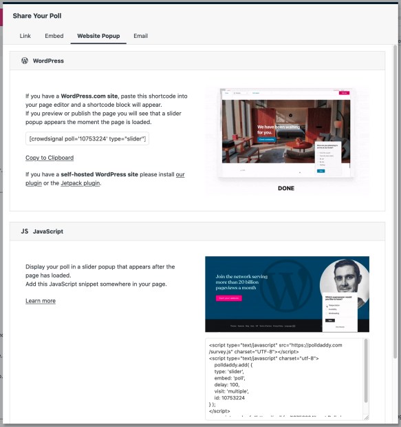 To get started, go into your Crowdsignal poll and click the share button in the top right corner of your screen. A share window opens up, with a navigation menu at the very top. Choose the “Website Popup” tab: