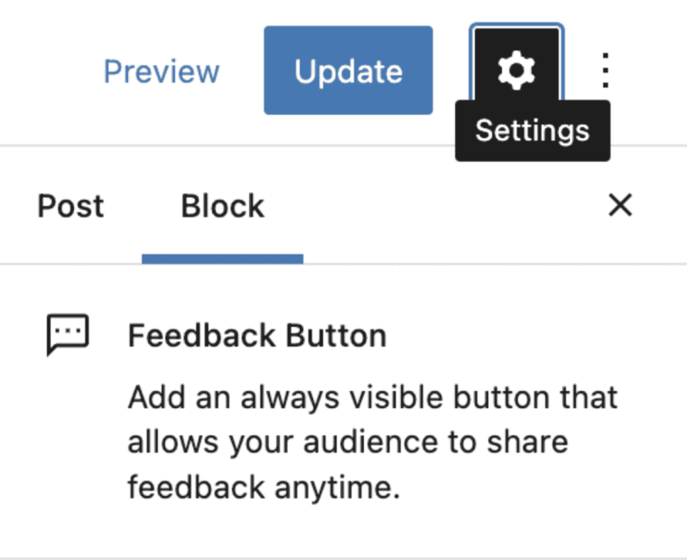 In order to see the Feedback button block settings, click the cog icon next to the Publish/Update button in the upper right corner.