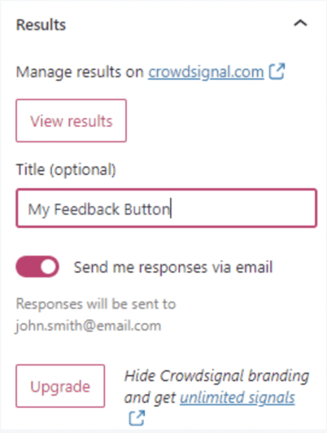 - View results: to view the submitted feedback, make sure to connect the same WordPress.com account you used to insert the feedback button to Crowdsignal. By clicking the ‘View results’ button, you will be taken directly to the results.