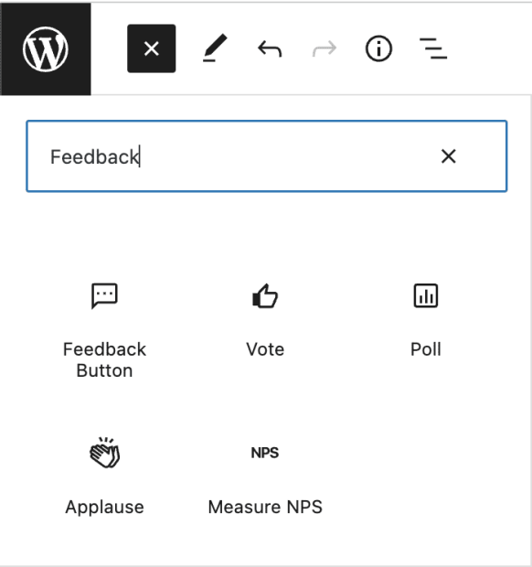 To add the Feedback button block, click on the block inserter + icon and search for ‘Feedback Button’. You can also type /feedback and select the block when it appears.