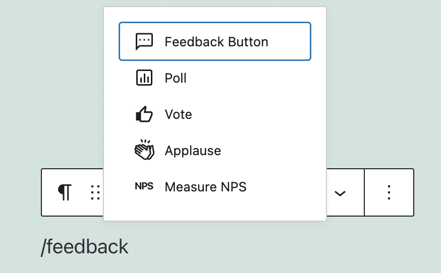 The block toolbar shows the options that the feedback button offers: