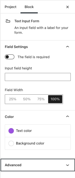 Besides using the circles to resize the form field, you can enter manual height dimensions and select width as a percentage of the block’s overall size.