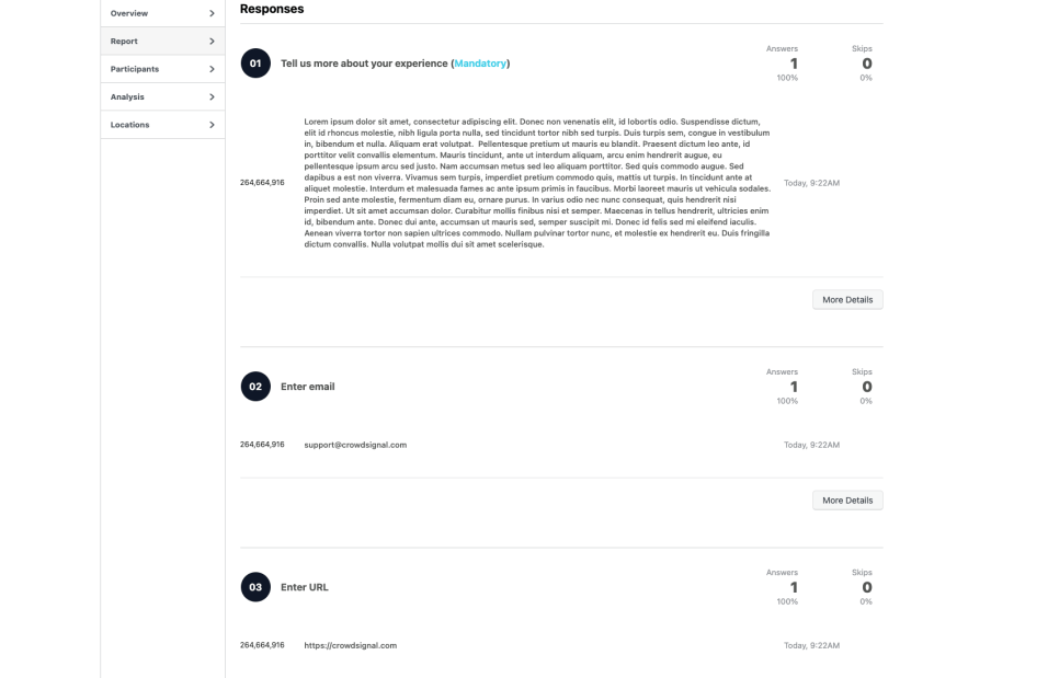 Crowdsignal Projects offer three blocks to collect additional information outside of the regular Question blocks that are part of your project. These blocks allow you to capture additional information that do not quite fit into a traditional survey, poll, or quiz. You can use these for things like gathering additional comments, collecting emails to directly reply to users and any other secondary information you would like. These blocks can be used with the others to create a hybrid survey contact form, or even used alone to create a traditional contact form.