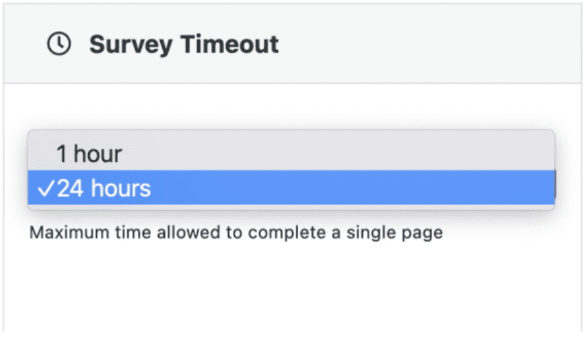 Business, Team, Corporate (legacy plan), and Enterprise (legacy plan) users can change this timeout in the survey editor, setting the timeout to either the default 24 hours, or 1 hour.