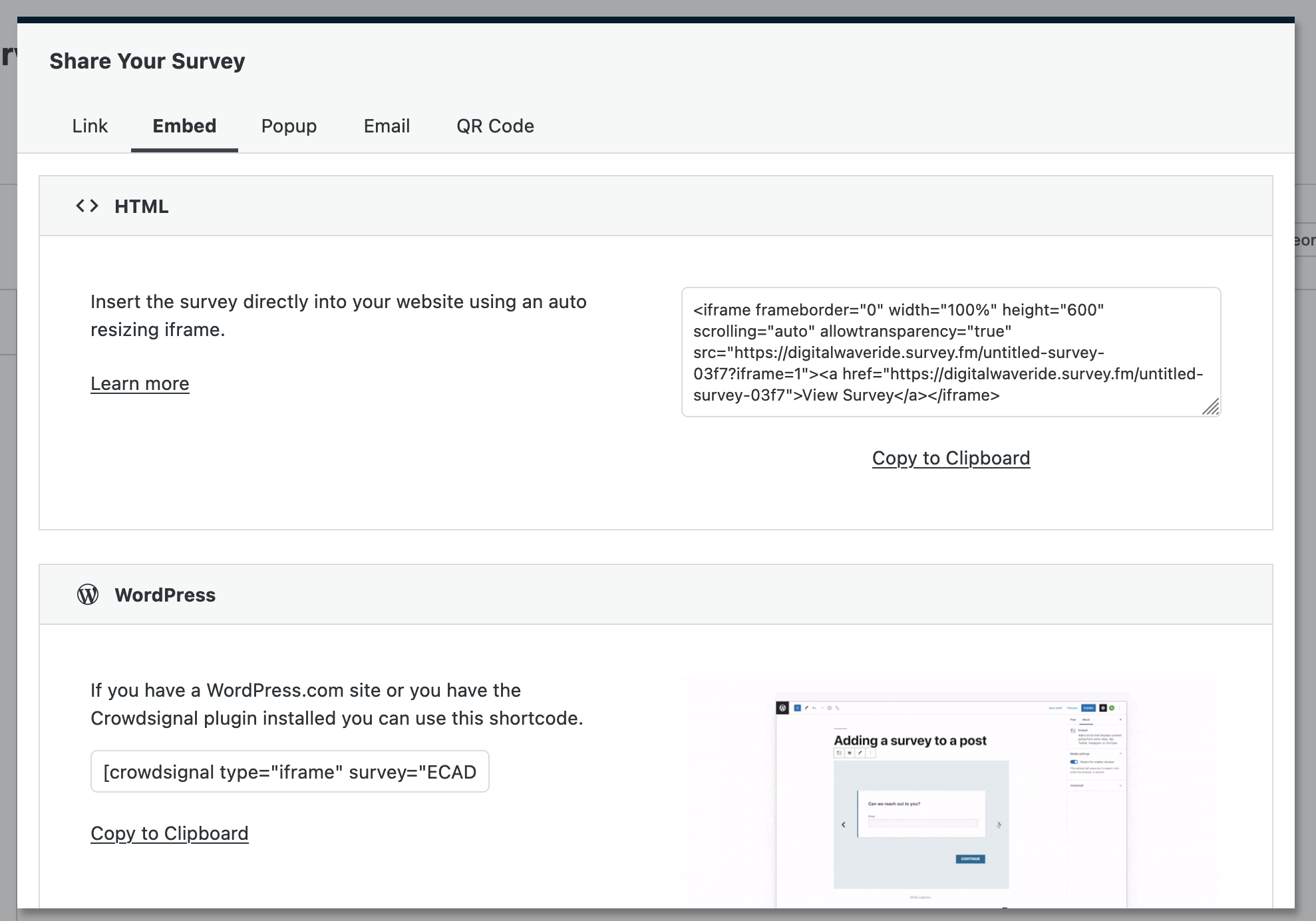 If you have a WordPress site, things are even easier: Just copy the link of your survey, or the shortcode into your WordPress editor, and the survey will be embedded. Simple.