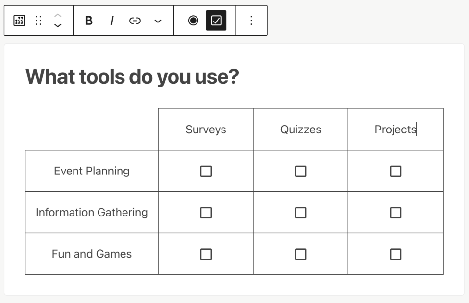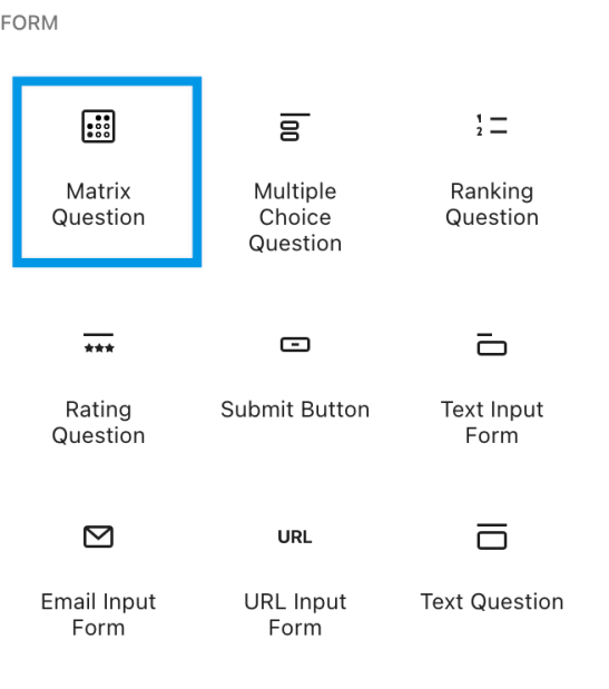 Select Matrix Question from the Crowdsignal Blocks section of the block Picker. You can also search for “Matrix” in the new block search or type /matrix on a new line in the editor.