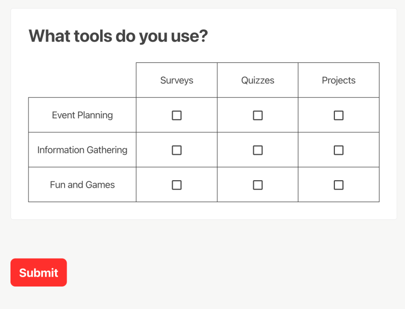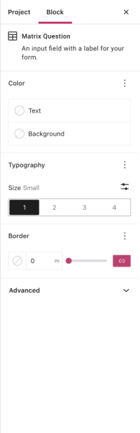 The Matrix question block is similar to the multiple choice question block, but it is presented as a table of related questions and answers. It is typically used to collect data that has identical answers (i.e., rate your preference – poor, good, excellent).