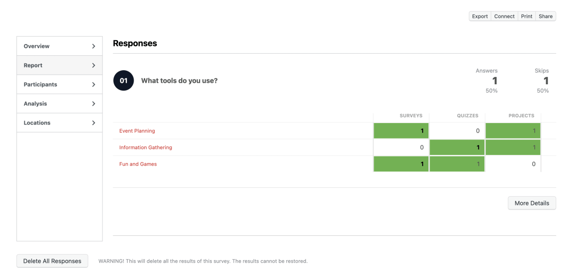 The results of a project with a matrix question can be viewed the same way as any other project. Results are available either directly via the editor by clicking the results tab or from the Crowdsignal dashboard