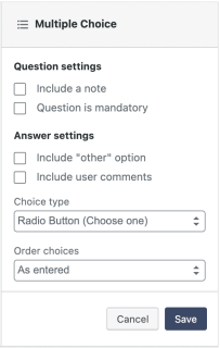Choice Type – Use this dropdown to change how the multiple choice question is presented to the survey participant. There are four types to choose from: Choose one (radio), Choose one (list), Choose many (check), and Choose many (list). You can see a sample of how each of these types appears within your survey below.
