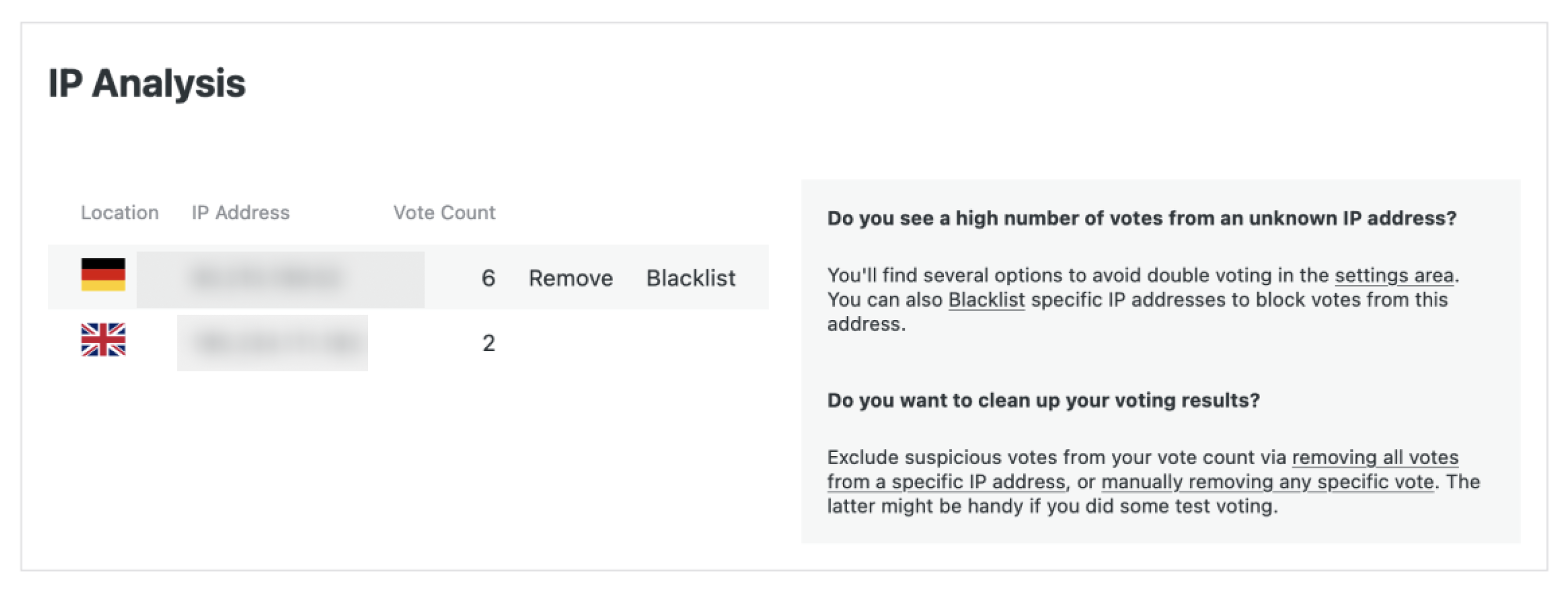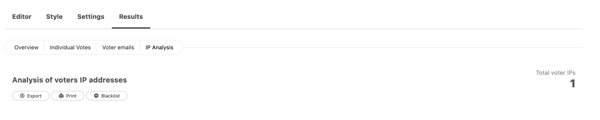 When an IP address is blacklisted the votes from that IP are deleted and new votes from that IP are ignored. (Advanced tip: If you go to “See all votes -> IP Analysis” a new Blacklist menu item appears next to the Print and Export buttons. This allows you to list blacklisted IP addresses.