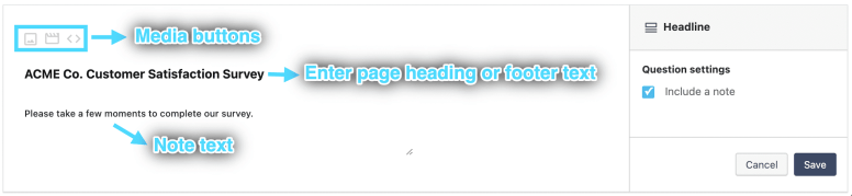 Clicking on the Headline button or clicking and dragging it into your survey page will create a heading for your survey page, allowing you to split the survey into sections. Think of this as a chapter marker. This element can also be used as a footer.