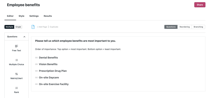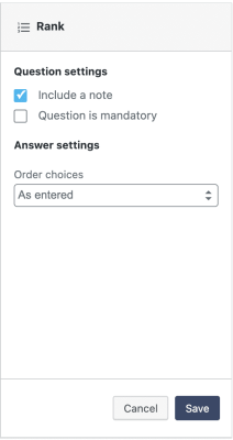 The Rank question type allows participants to order their choices by clicking and dragging answer options into their desired order.