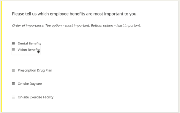 Here’s how the ranking question appears in the survey. Note that participants simply click on each answer option and drag it into the order they prefer: