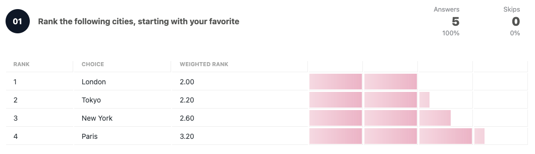 The results page will show the list of answers ordered by the weighted rank, which is calculated considering the answer’s position on each response.