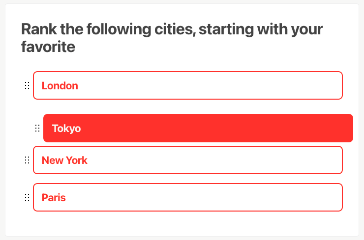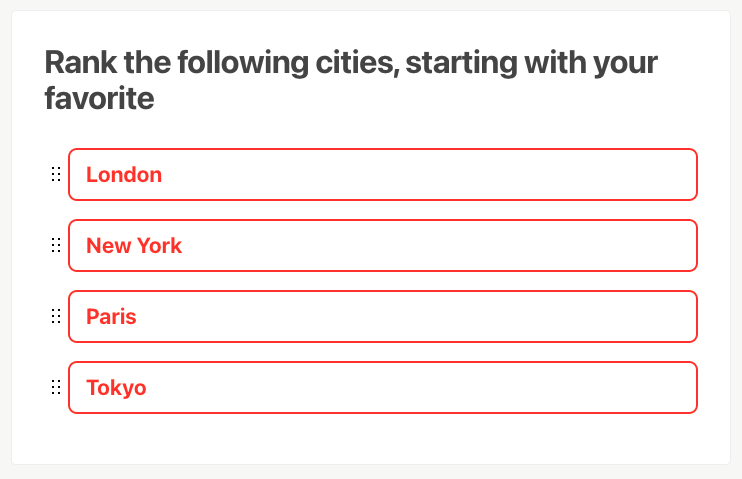 The Ranking Question block is a type of question that, from a list of options, allows dragging each option individually to sort them in a specific order.