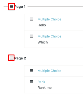 Similar to moving questions, drag a page using the drag icon. All of the questions will display inside the page to make it easier to see what you are moving. All questions within a page are moved when the page is reordered.