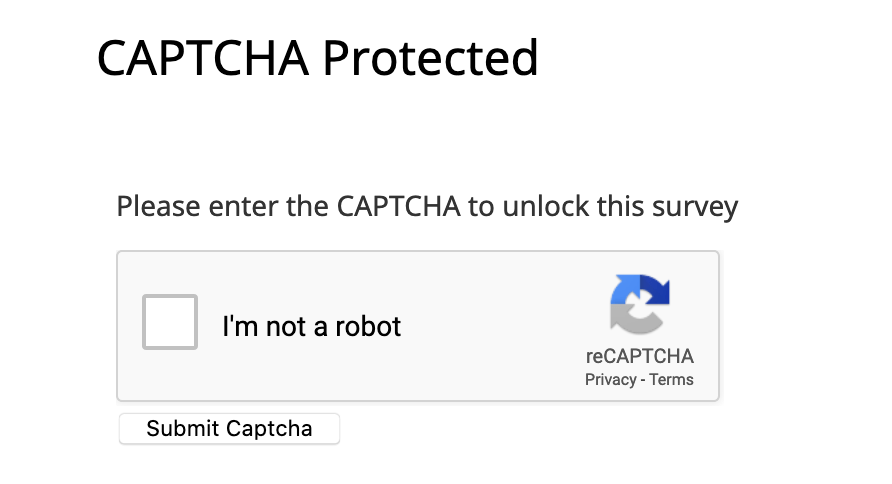 You can enable Captcha protection to force the survey participant to fill in a CAPTCHA form before accessing the survey. This is a good way to prevent automated responses by scripts or bots.