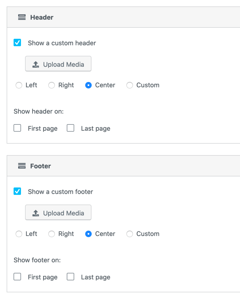 Choose whether to show a custom header and/or footer on your survey, and optionally on the first and/or last page of your survey. This feature only works for Surveys with Multiple Questions per Page setting.