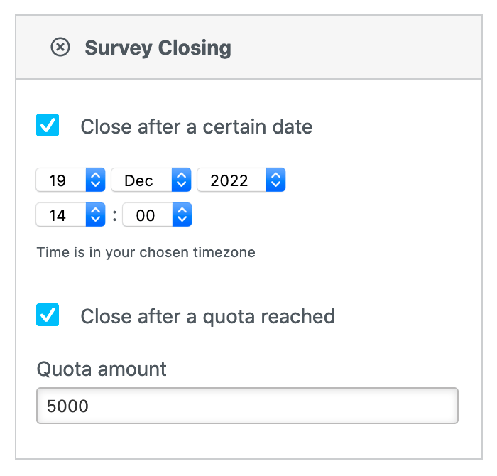 You can set your survey to close automatically either on a specific date/time, or after a specific quota of responses have been submitted.