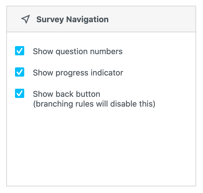 You can choose whether to display question numbers next to each question, whether to show a progress indicator on your survey, and whether to show a back button on surveys with multiple pages (note that adding branching rules will disable the back button.)