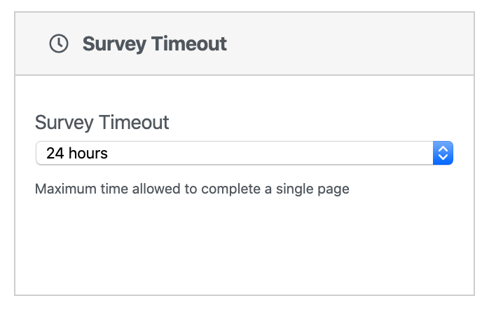 Account holders with one of our paid plans can change the page timeout of a survey. This is how long a user has to finish a survey as a whole. The default is 24 hours, but it can be changed to 1 hour if circumstances require it.
