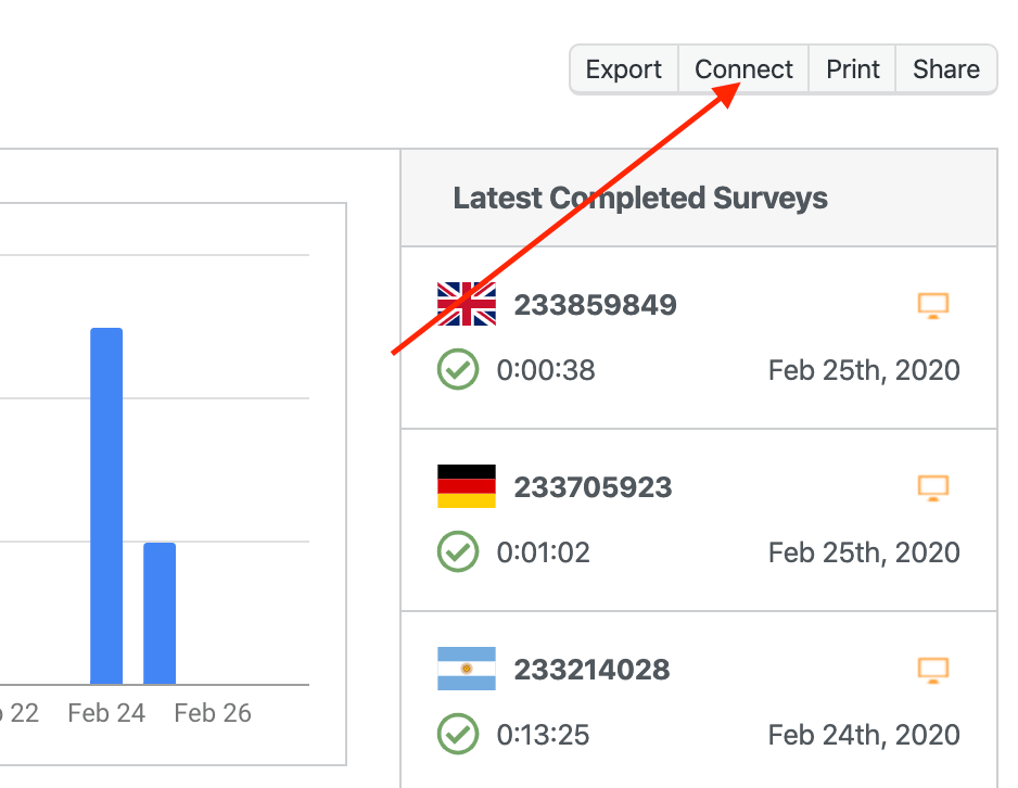 To start the connection process, visit the Results tab for a Survey, and then click on the Connect button: