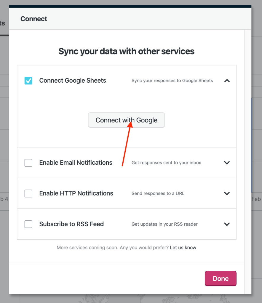 If you’re looking to further analyze your Survey’s data and make it easy to collaborate on it with others, you can sync your Survey’s results data in near real-time to Google Sheets. Note: To use this feature you must have a Premium, Business or Team plan.