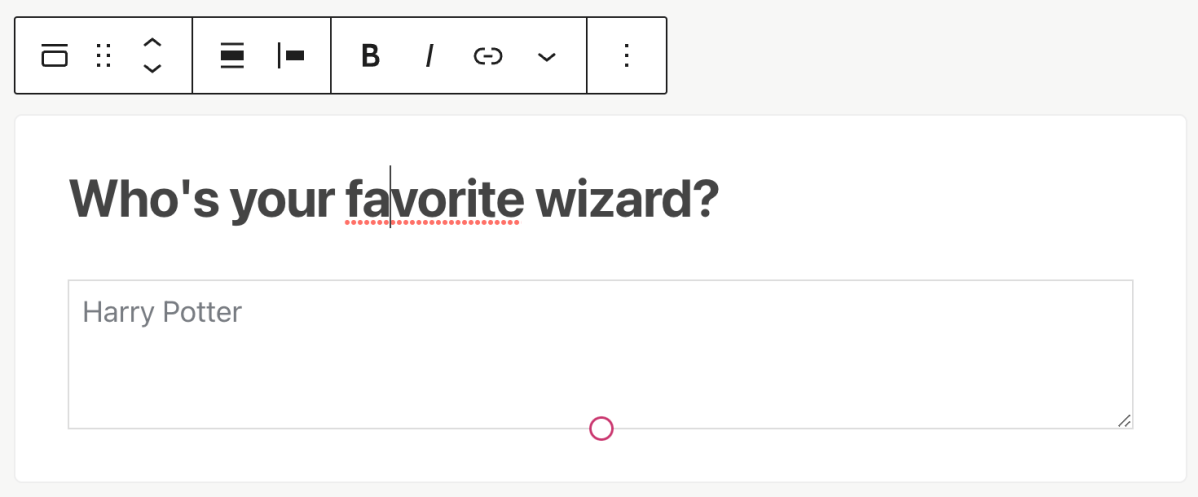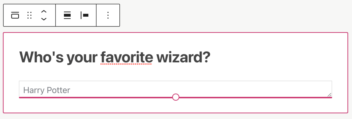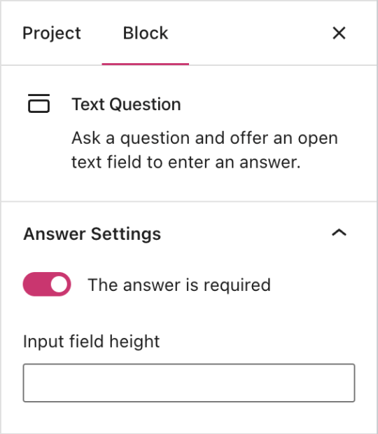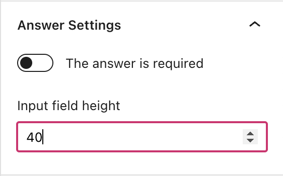 You can also resize the input height to suit your needs. You can do this by dragging the handle at the bottom of the input, or manually typing in a value in the block sidebar.