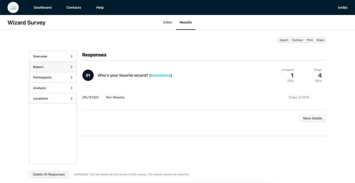 Go to “Results” -> “Report” or “Results” -> “Participant” to see the results for your new text question blocks.