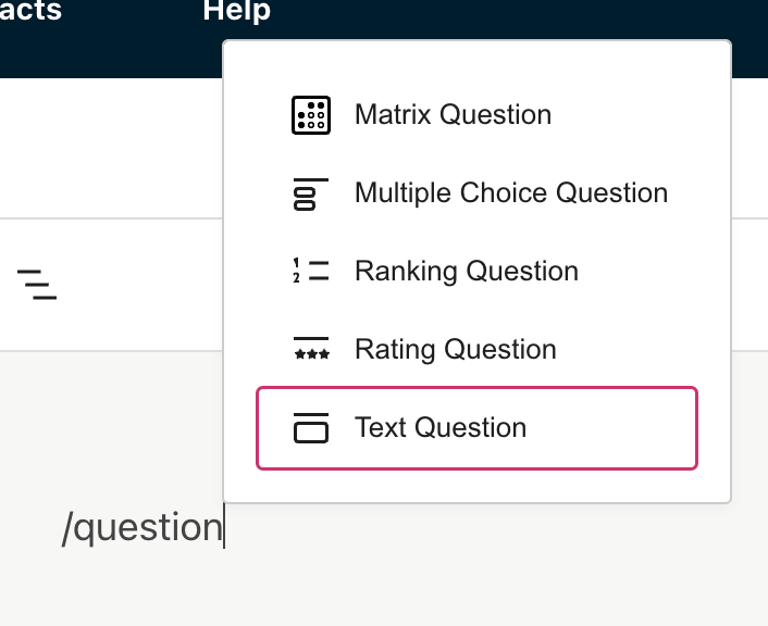 You can also type /text question into the editor, which will give you the option of inserting a text question block in that place.
