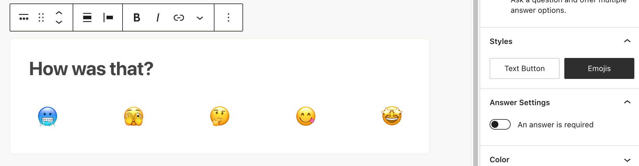 Once you add the Rating block, you’ll see a question placeholder and a default style: