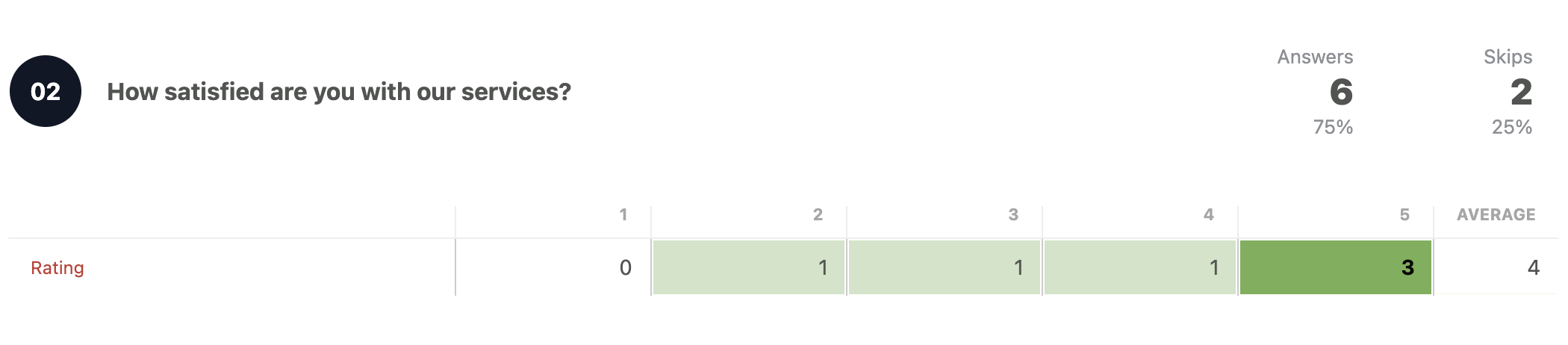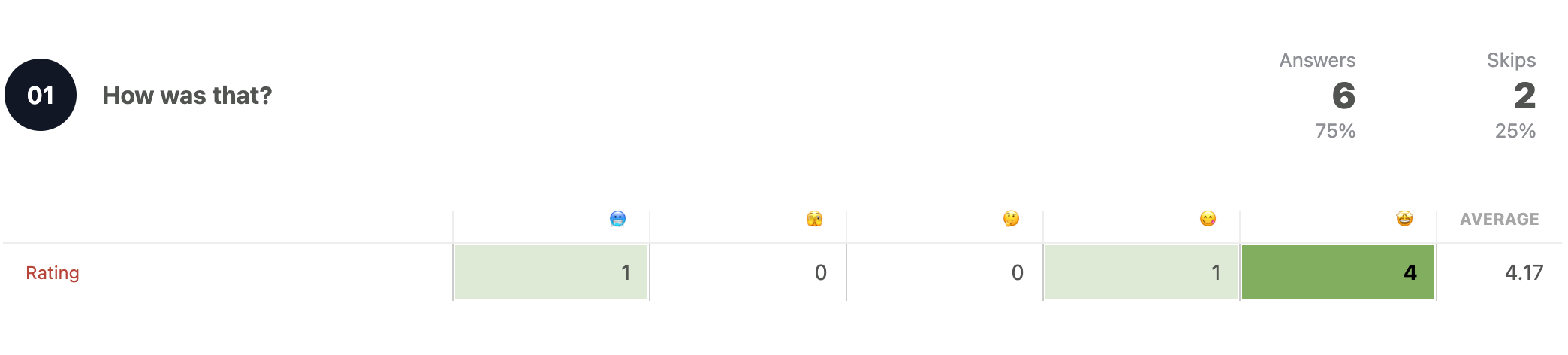 There’s a special thing about a Rating block results: they store two values. The “text” value, being it a number, letter, emoji, etc, and an underlying value going from 1 to 5. This way, when you check or export results, you can do quantitative research and averages.